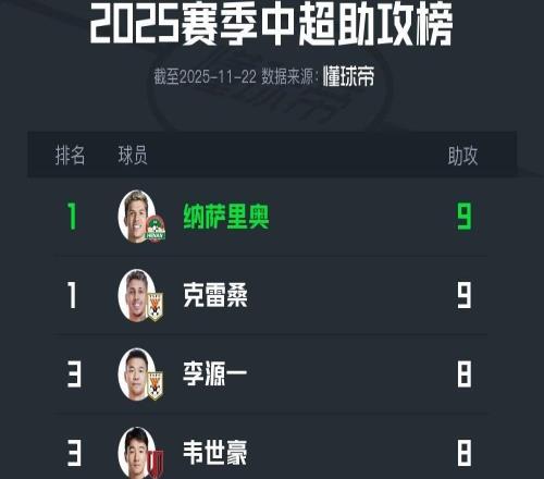 2025中超助攻榜:纳萨里奥、克雷桑9次并列第一,韦世豪8次