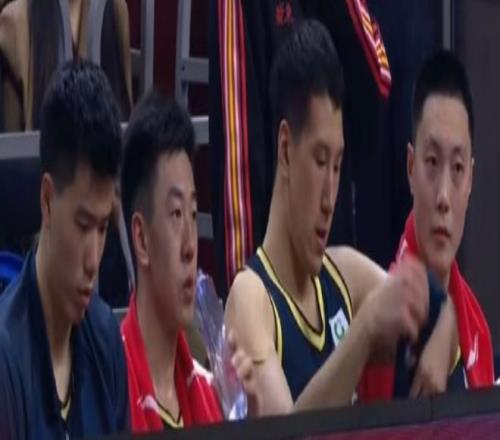 再来看看广东男篮末节还剩5分钟左右替补席的沮丧情绪吧,胡明轩的脸上写满了沮丧,王少杰感觉都要输哭了,广东三个外援非常无奈,萨林杰、奎因、萨姆纳应该就想比赛快结束早点离场吧。