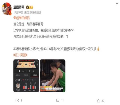 辽篮资讯:赵继伟全场最高24分帮助辽宁拿下胜利,这种感觉久违了。