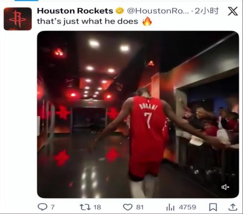 这场比赛的赛后,火箭队有很多的球迷在球员通道排队等待杜兰特,他们一一跟kd击掌致敬,所有人都知道这场胜利是杜兰特帮忙拿下的,外界都说37岁的杜兰特是休斯敦的雇佣兵,但他却不止一次说热爱这座城市,为这座城市而战很荣幸。