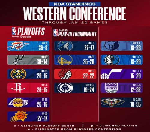 北京时间1月21日,NBA常规赛打完,西部的格局再度出现了变化,休斯顿火箭队升至第四,洛杉矶湖人升至第五,菲尼克斯太阳升至第六,森林狼则掉到第七,勇士则还是维持第八,快船艰难维持第十。