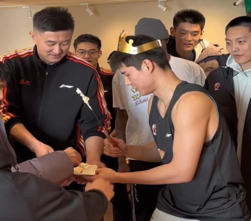 陈家政还专门拿了一块蛋糕给杜锋,这样的待遇已经拉满了。杜锋在旁边非常开心,因为陈家政是潜力球员,杜锋一直都在给到他信任,必须要好好感谢下。